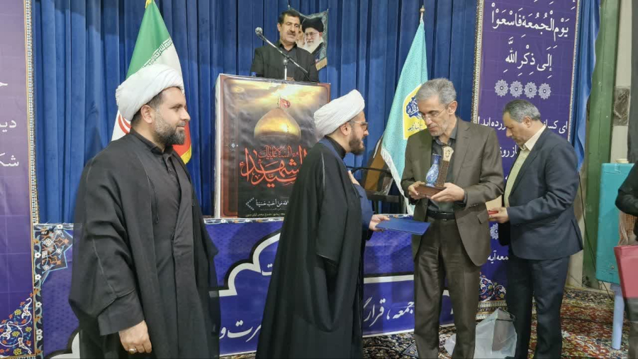 برپایی میز خدمت و تقدیر شهردار زیباشهر مهندس صابری از امام جمعه زیباشهر حجتالاسلام والمسلمین حاج آقا افشاری به مناسبت ۵ مرداد اقامه اولین نماز جمعه کشور