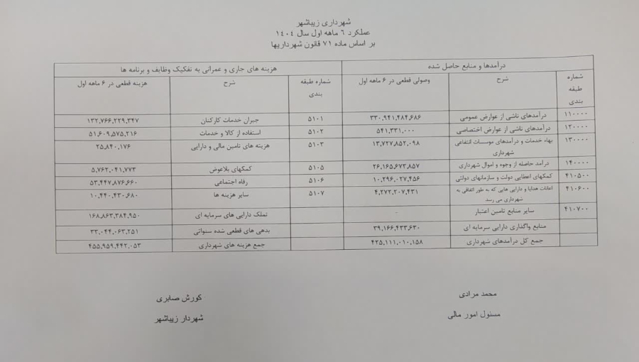 عملکرد 6 ماهه اول سال 1404 بر اساس ماده 71 قانون شهرداریها